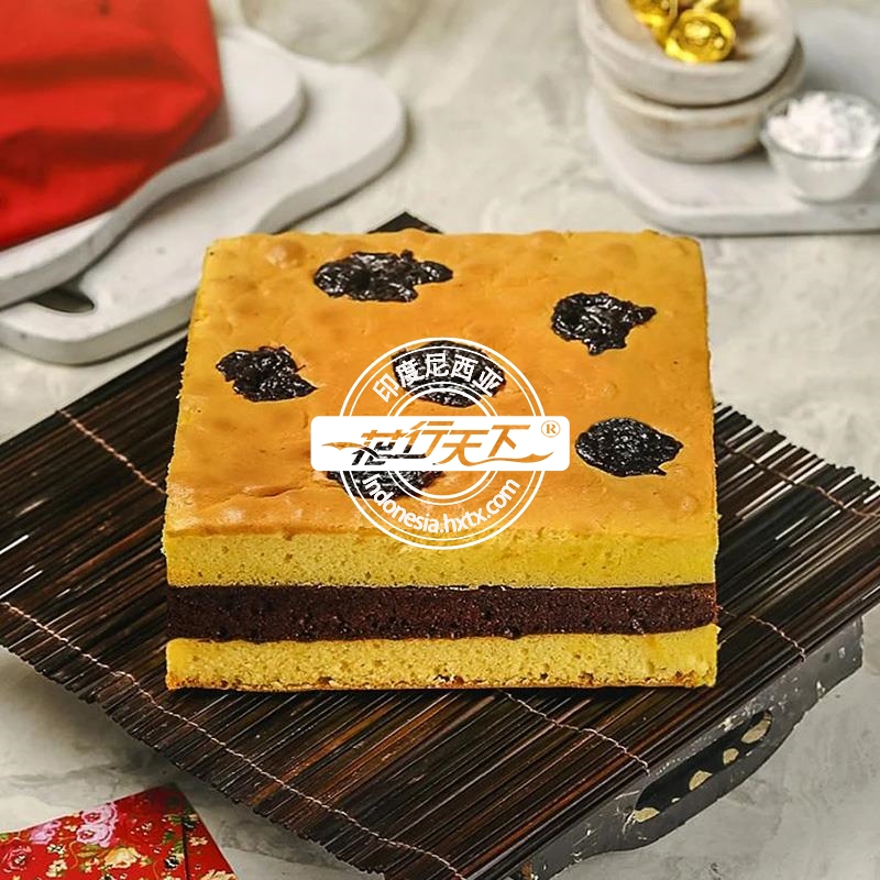 描述: 柔软的千层蛋糕,中间夹有巧克力海绵蛋糕,顶部撒有西梅干(20cmX20cm)。